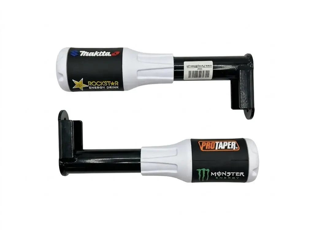 The high-visibility white and black finish is accented with premium heat-sealed graphics from top racing brands like Makita, Rockstar, and Monster Energy. These rods don’t just protect; they transform the stance of your bike, giving it a wider, more aggressive look. Designed with integrated mounting brackets for a secure fit, they are an essential upgrade for any rider looking for professional-grade protection on the busy streets or open roads.