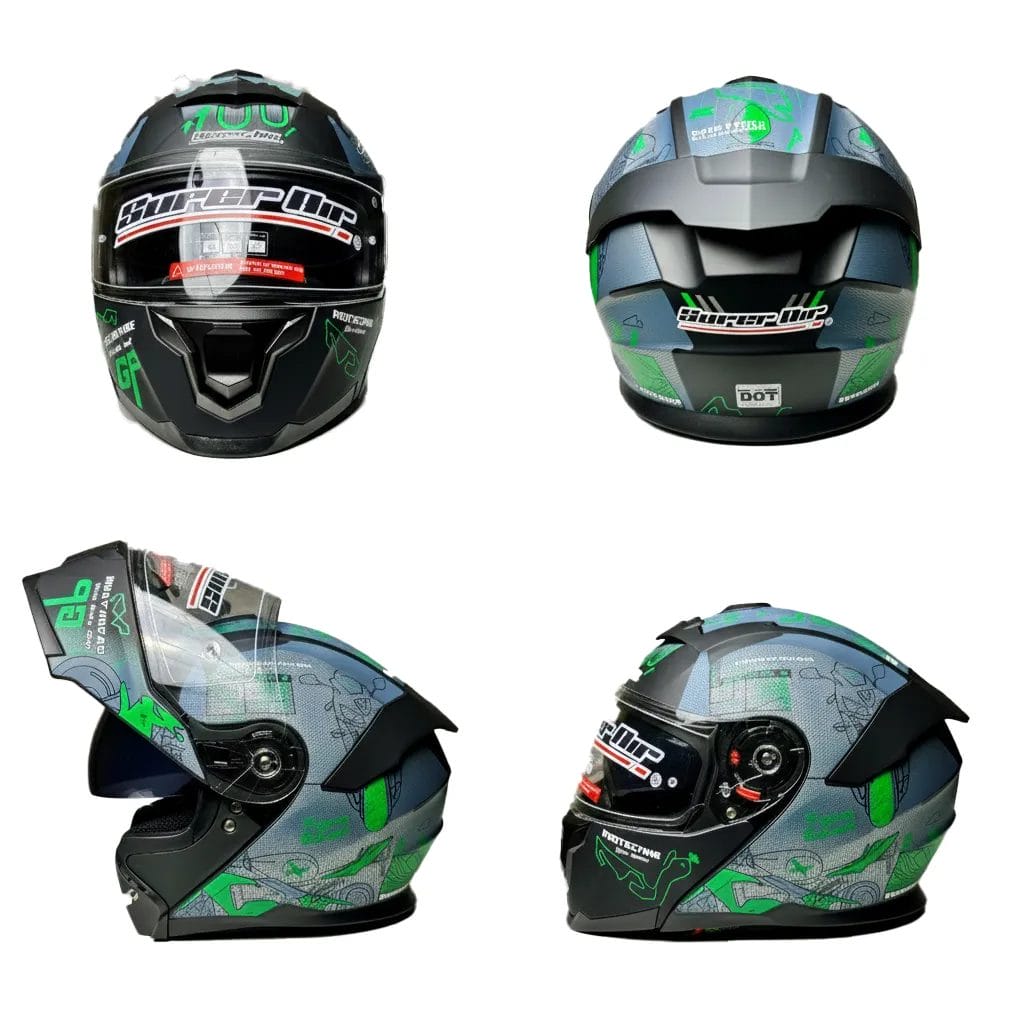 Embrace the spirit of the circuit with the Super Air 912 Modular Helmet in its exclusive Green GP colorway. Featuring intricate racing-inspired blueprints, “GP” branding, and “Always Ahead” detailing, this helmet is designed for those who appreciate technical precision and bold style.